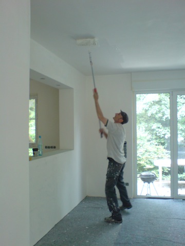 Allen voran natürlich der Komplettanstrich der Decken und Wände. Hier hatten wir wieder tatkräftige Unterstützung eines Bekannten, der die komplette Hütte in grade einmal 4 Tagen fast fertig gestrichen hat, und das 2x ! Einzig im Wohnzimmer drückte sich das Nikotin wieder durch den Anstrich, weshalb am Freitag mit einer speziellen Farbe (Nikotonversiegelung) drüber gestrichen werden musste. Da das Weiß dieser Versiegelung jedoch heller war, als das restliche Weiß im Haus, muss am Montag noch ein letztes Mal nachgestrichen werden.